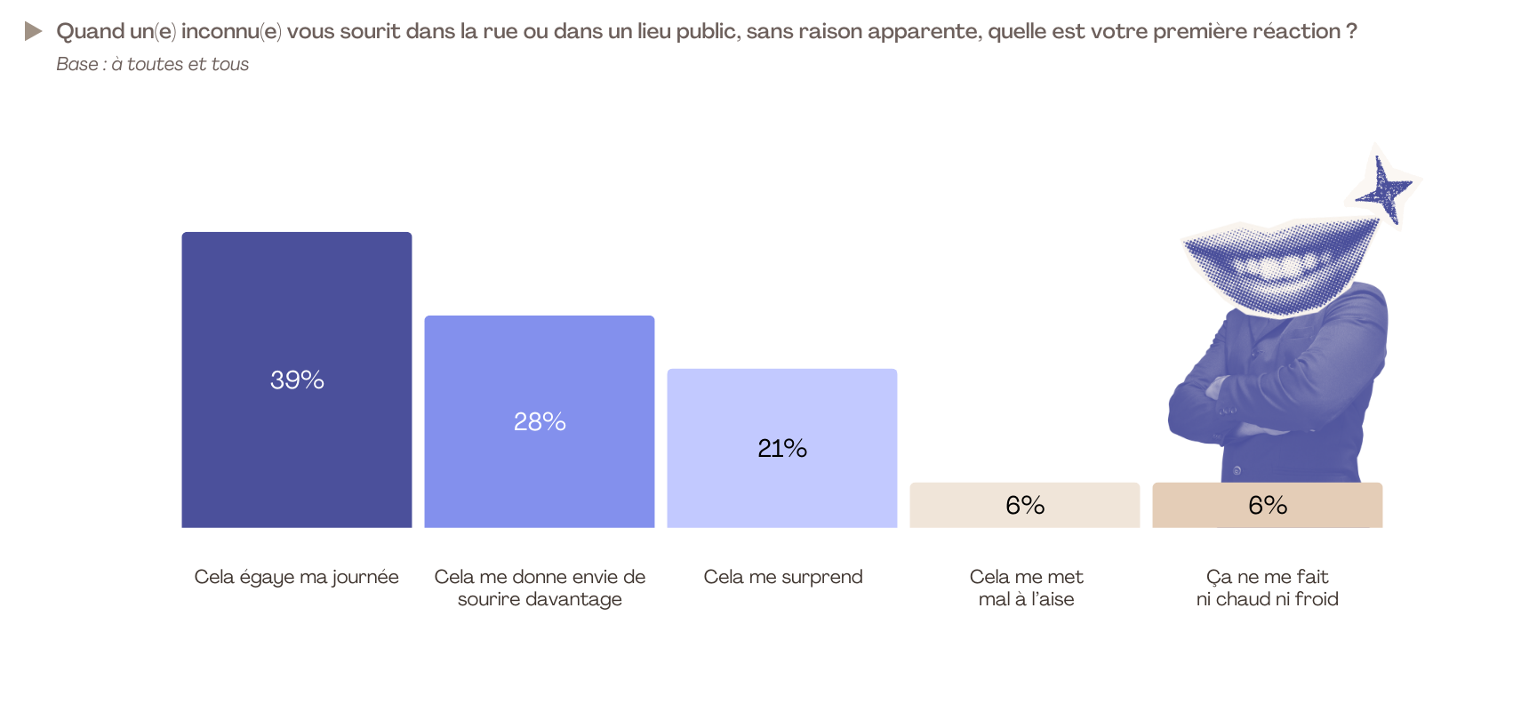 Près de 4 Français sur 10 (39 %) déclarent qu’un sourire croisé dans l’espace public égaye leur journée, et 28 % affirment qu’il leur donne envie de sourire à leur tour. Seuls 6 % disent que cela les met mal à l’aise.
