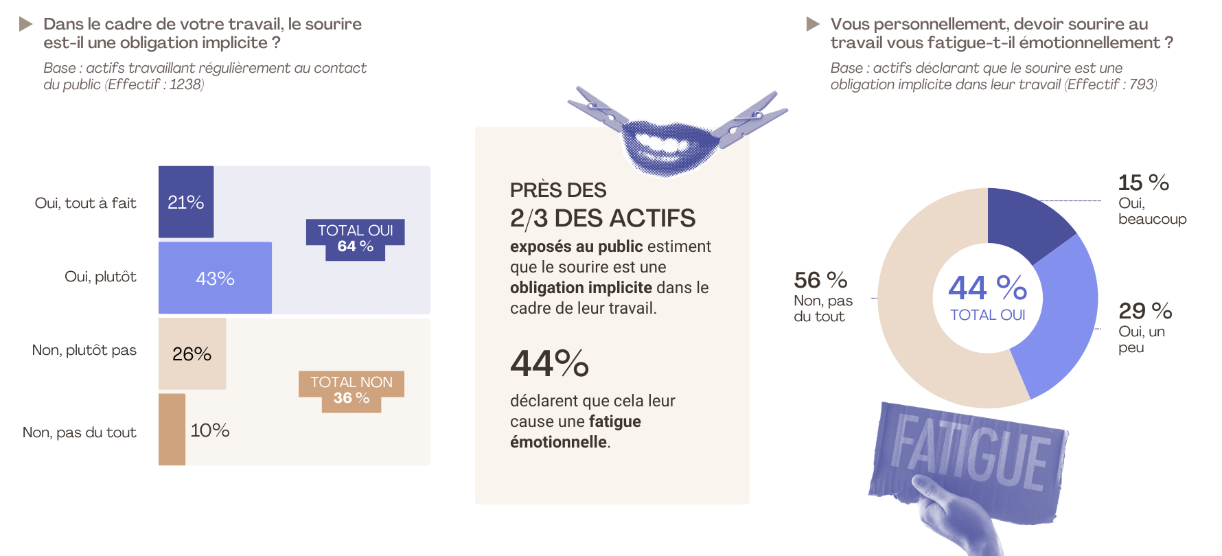 ℹ️ Ces résultats font écho à des travaux scientifiques (Universités de Buffalo et Pennsylvanie, 2019) qui ont mis en évidence les effets délétères des « sourires de façade » : épuisement émotionnel et comportements compensatoires, tels qu’une consommation accrue d’alcool.